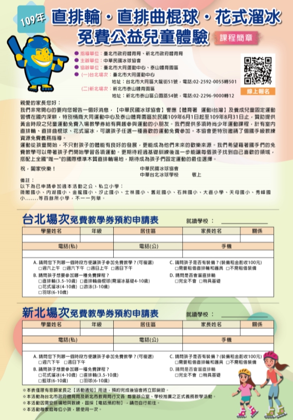 一、揭活動由中華民國冰球協會主辦,訂於109年6月6日至8 月31日假本市大同運動中心5F溜冰場辦理,包含直排輪、 直排曲棍球及花式溜冰等免費體驗活動。