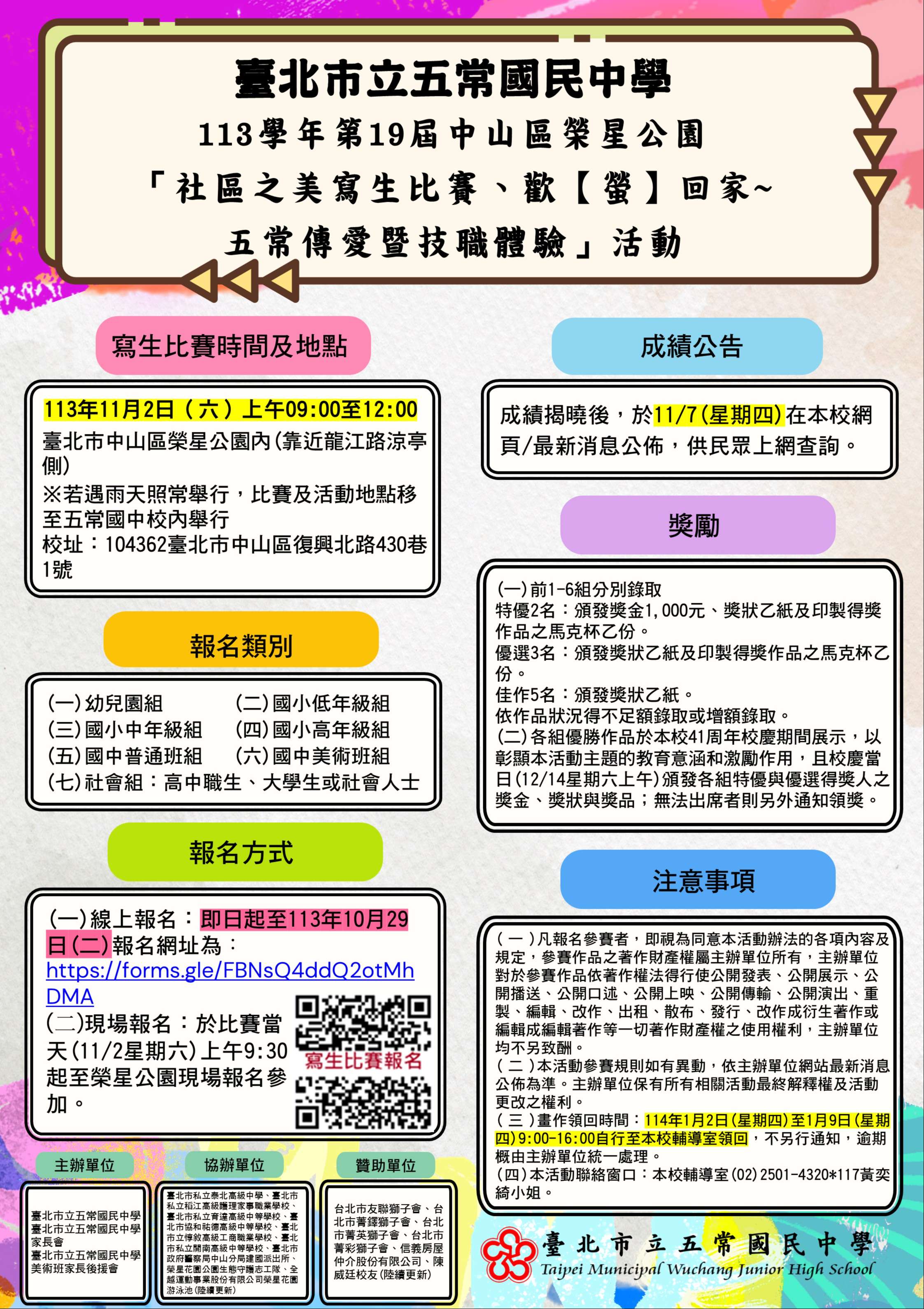 一、比賽時間:113年11月2日(星期六)早上9時至12時整。 比賽地點:榮星公園內(臺北市中山區民權東路三段與 龍 江路口),若遇雨天照常舉行,比賽地點移至五常國 中校 內。
