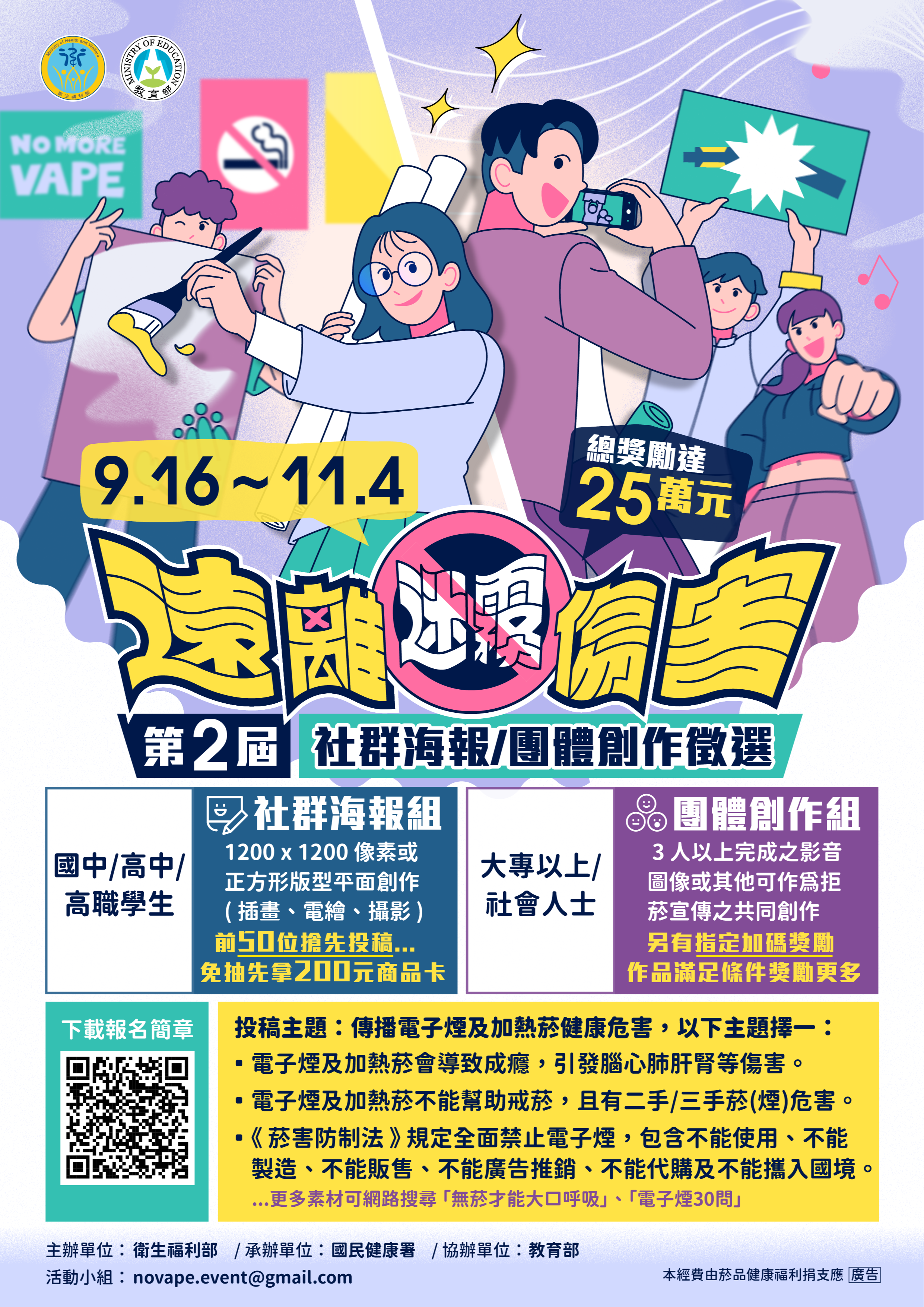 二、為避免電子煙、加熱式菸品等新興菸品入侵校園,造成健康危害,衛生福利部(承辦單位:衛生福利部國民健康署)爰與教育部共同辦理旨揭活動(徵選簡章如附件1、活動海報如附件2),以宣導電子煙及加熱式菸品等新類型菸品之危害,共同維護青少年健康。活動相關內容如下: