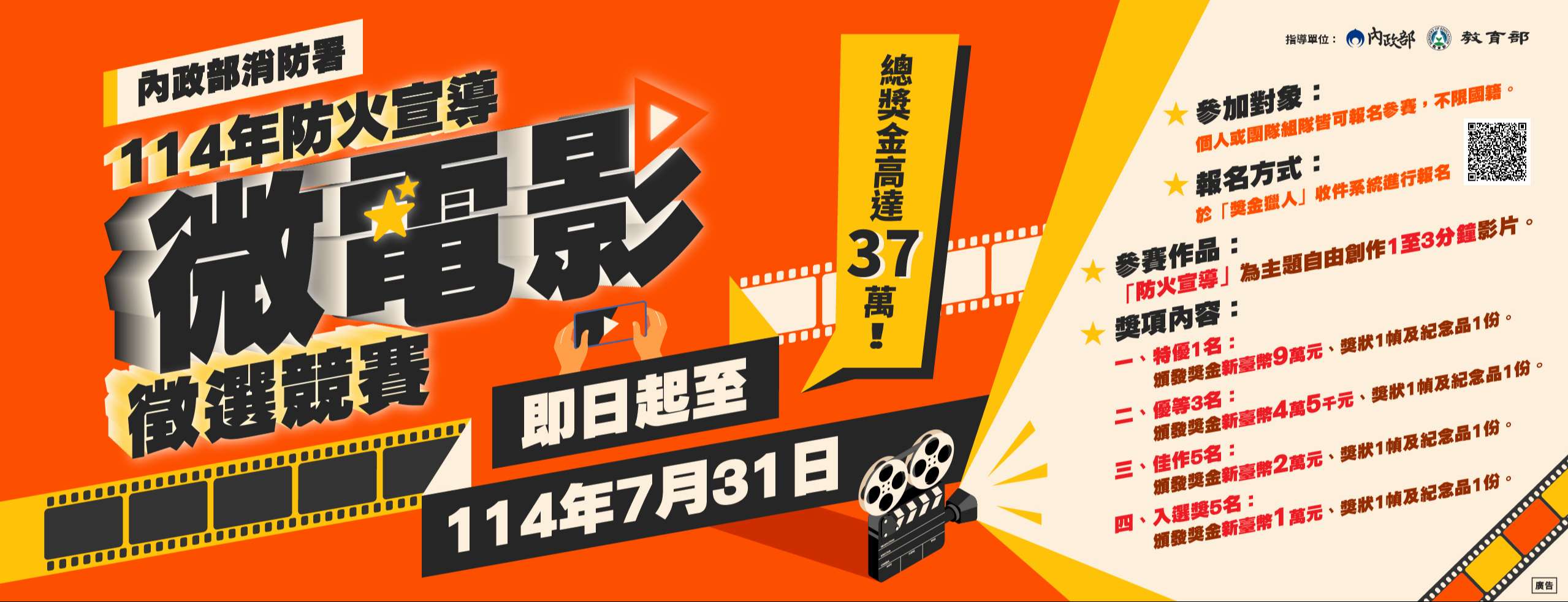 內政部消防署辦理「114年防火宣導微電影徵選競賽活動辦法」及徵件圖卡案,請對創作有興趣個人的或團體踴躍報名參加!