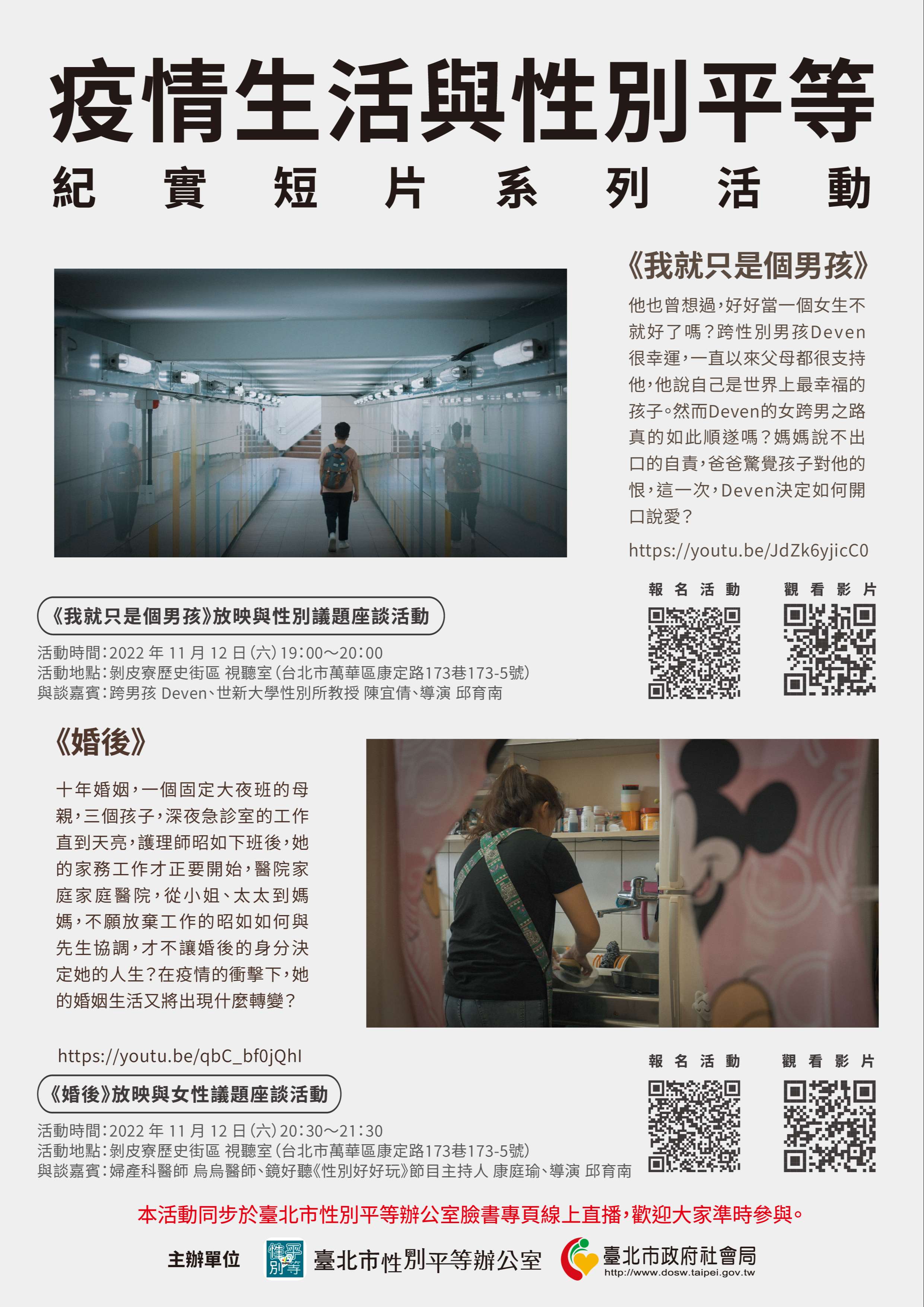 四、本市性別平等辦公室將在111年11月12日(六)晚上7時至9 時30分於剝皮寮歷史街區視聽室(臺北市萬華區康定路173 巷173-5 號)辦理「放映座談活動」,