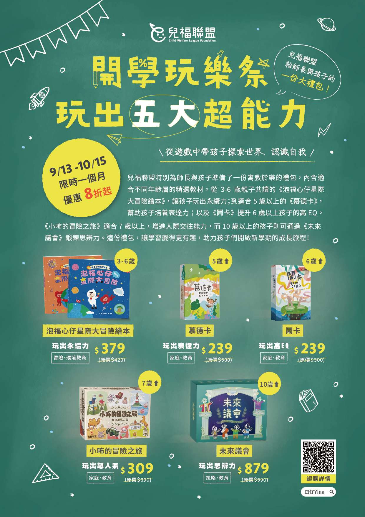 五、兒福聯盟為了不同年齡層孩子,精選適合的教材,讓孩子 們玩出五大超能力,即日起至10月15日優惠8折起,詳情請 參考附件海報說明。