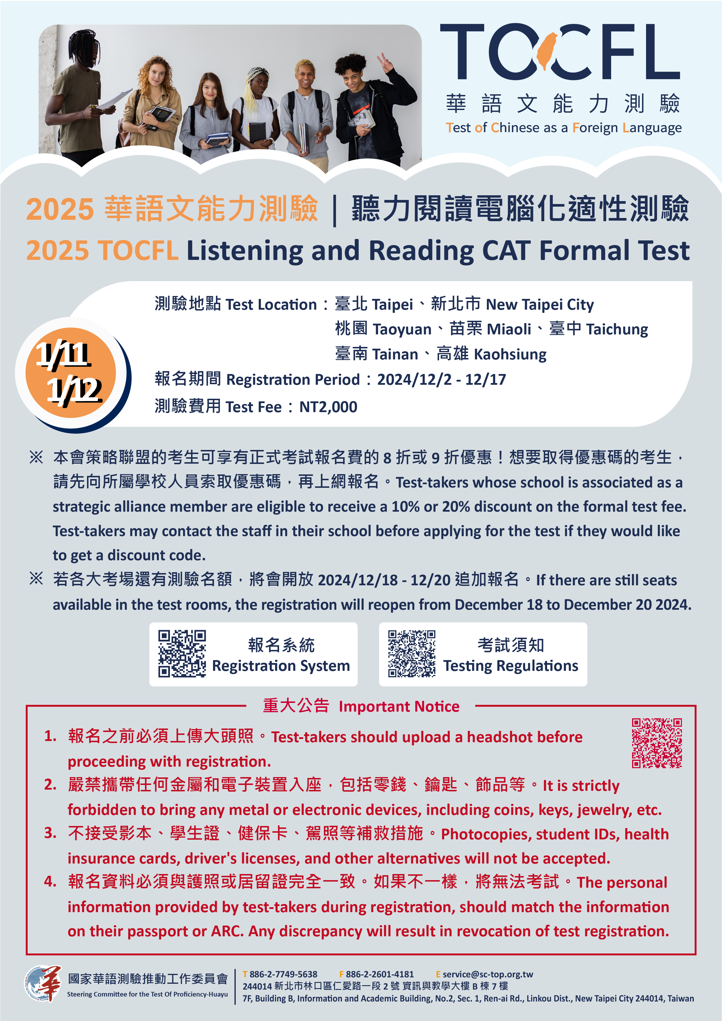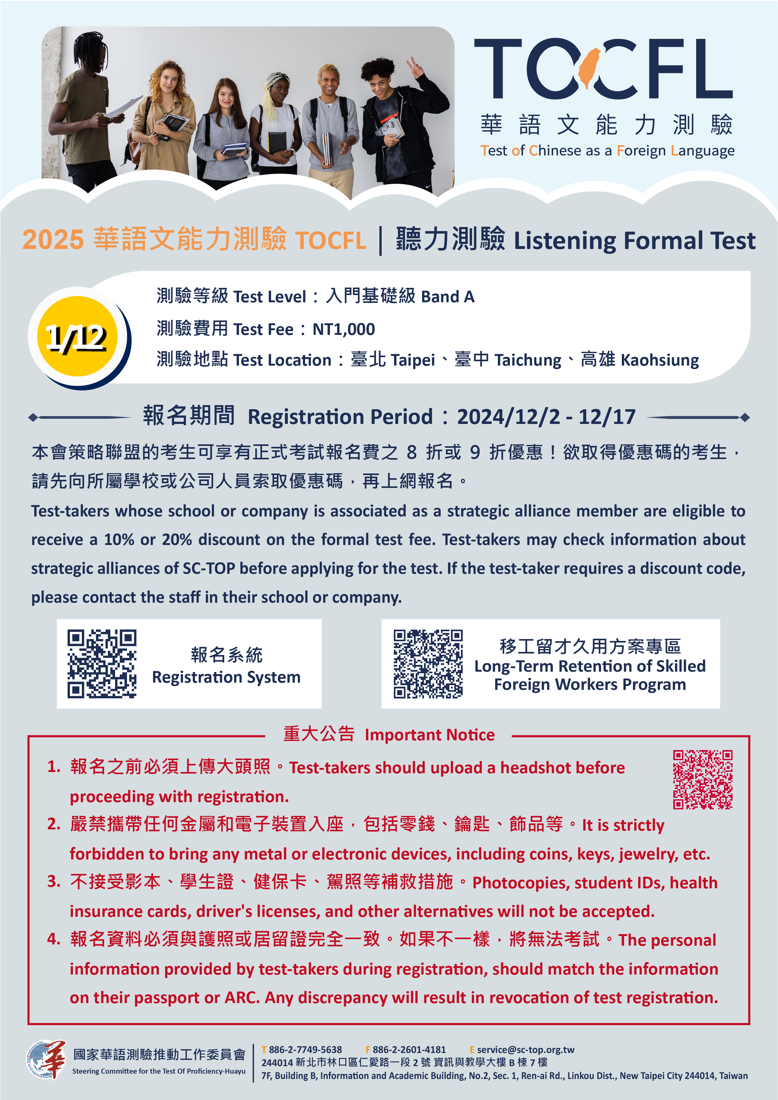 七、團體報名:以校為單位,考生人數超過30位可申請,詳情 請見官網:https://tocfl.edu.tw/tocfl/index.php /sign_up/tw/list/1。