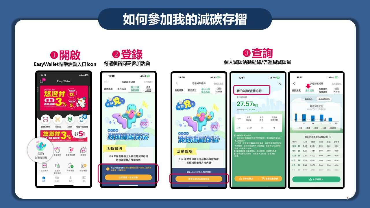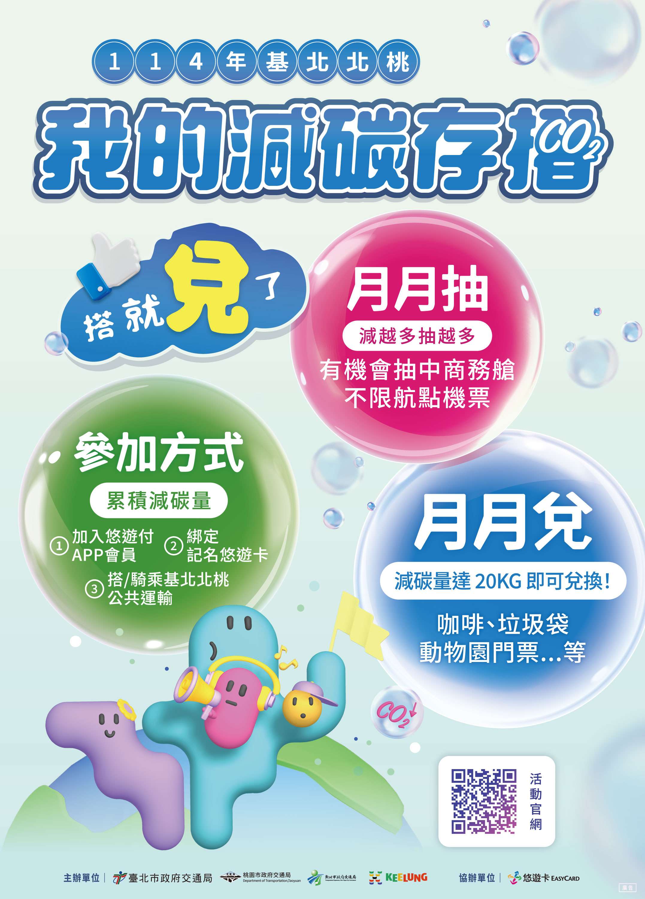 一、為攜手市民多加使用公共運輸,以朝淨零碳排目標前進,由政府、企業一起帶動全民綠運輸減碳,113年由基北北桃四市交通單位、公共運輸業者及悠遊卡股份有限公司共同推動,114年度擴大辦理並增加兌獎制活動,民眾累積達一定減碳量即可登錄兌換獎項,提高民眾參與誘因,活動辦理期間自114年1月1日至12月31日止,詳細內容可至本活動官網查閱114年活動資訊(https://co2- passbook.com