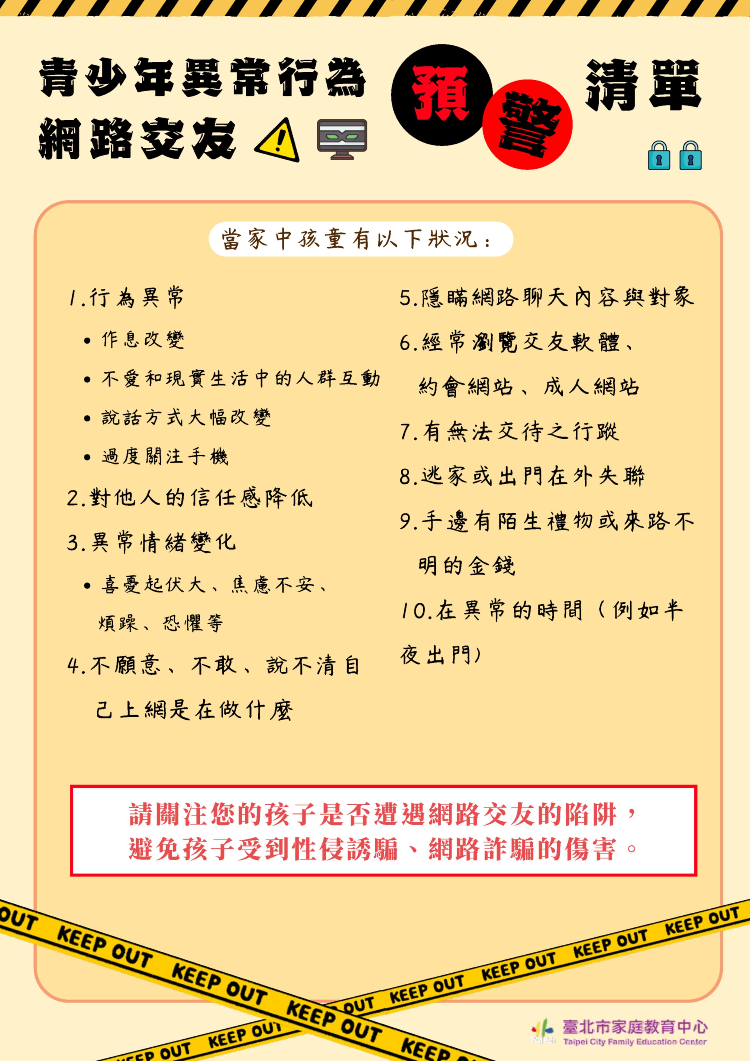 臺北市家庭教育中心製作「青少年網路交友異常行為預警清單」海報,內容列有10項實用之網路交友警訊,以察覺孩子是否已陷入網路交友的困境。