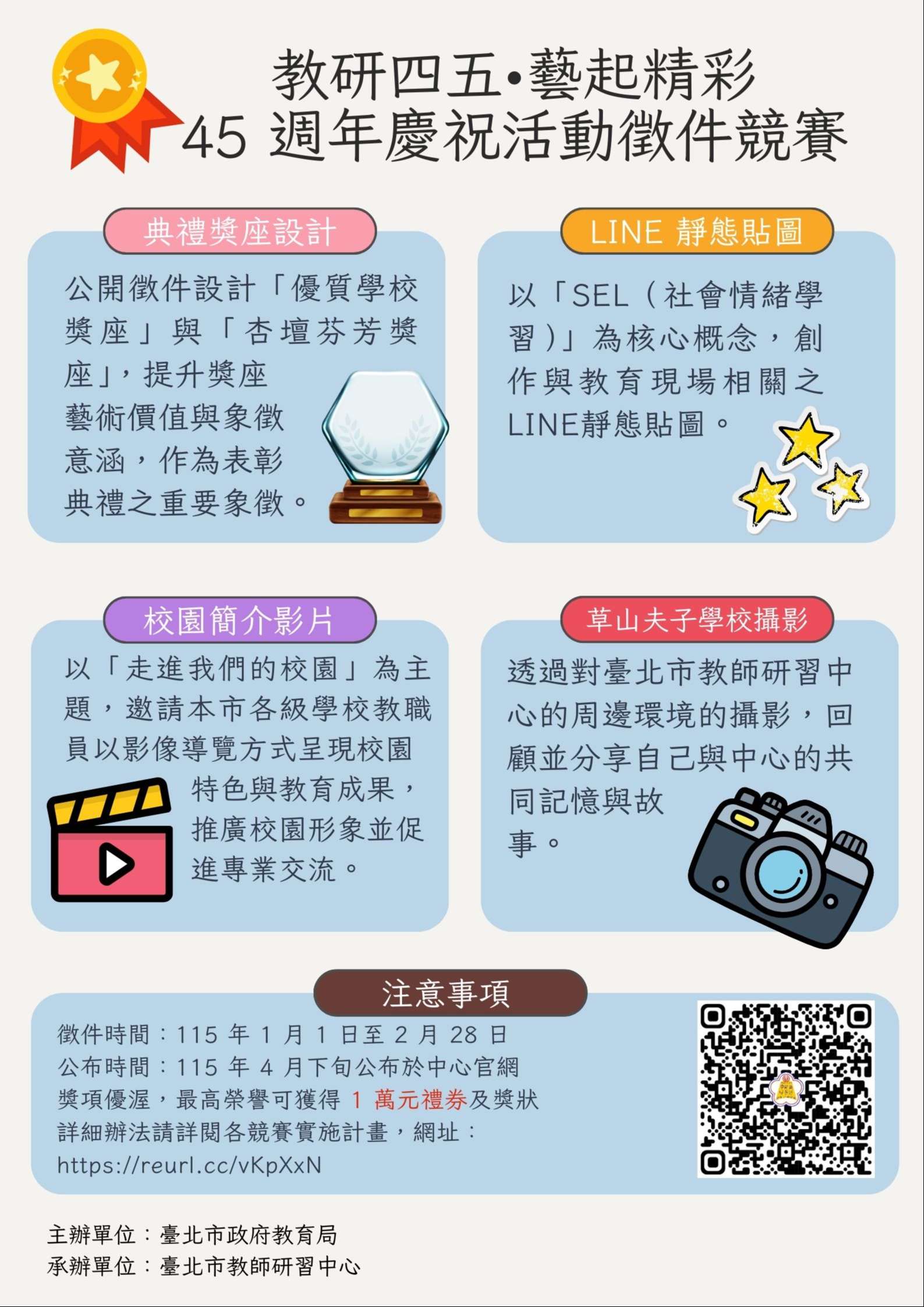一、臺北市教師研習中心將於明年迎來創立45週年慶。為紀念 此一重要里程碑,週年慶系列活動將回顧四十五年來的發 展歷程與教育成果,並規劃多元慶祝內容。期盼藉此凝聚 教育專業能量,共同開創教育的嶄新未來。配合本中心45 週年慶,規劃辦理4項競賽活動,以凝聚教育專業能量並展 現創新成果: