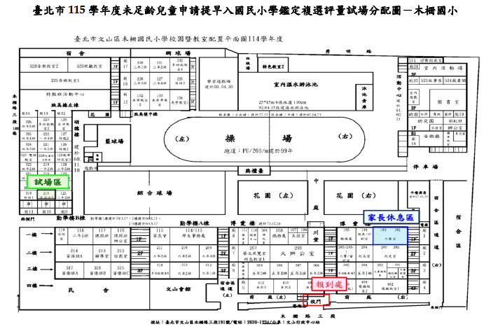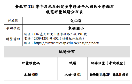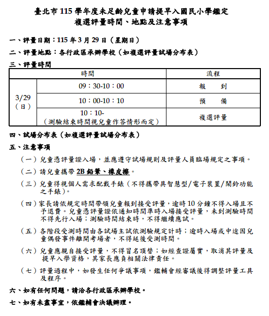 本校辦理(文山區)臺北市115學年度未足齡兒童申請提早入國民小學鑑定複選評量時間、地點及注意事項附檔資訊截圖供家長參考,請參與家長詳閱附件。