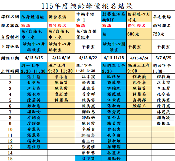 二、以下為報名結果,部分課程尚有名額,歡迎年滿55歲市民(課程開始前)報名參加:https://forms.gle/eNqE6LGFPLzi68mp9