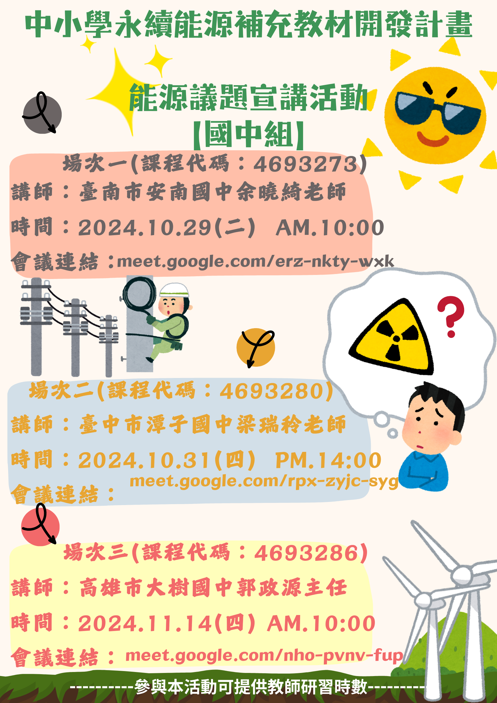 (四)【國中組】場次一(課程代碼:4693273);講師:臺南市安南國中余曉綺老師;時間:113年10月29日(星期二)上午10時0分至11時30分;
