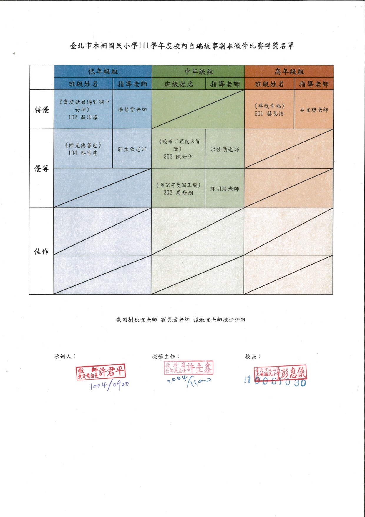 以下為111學年度校內自編故事劇本比賽得獎名單,恭喜獲獎同學,也謝謝辛苦的指導老師!