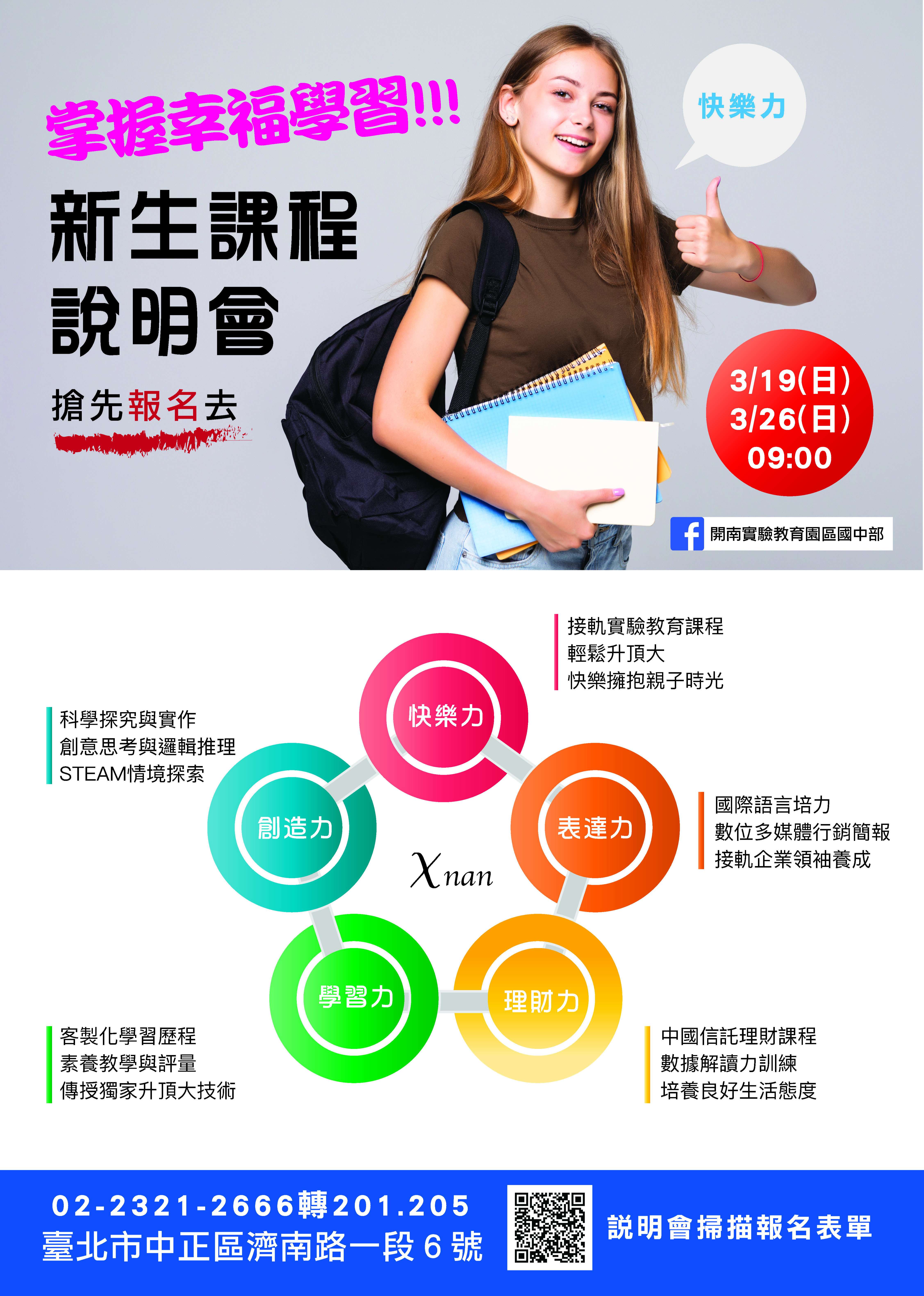 三、報名方式如下 (一)https://forms.gle/dxdsFTiYsVf6v65L7 (二)FB臉書粉絲專業:「開南實驗教育園區國中部」