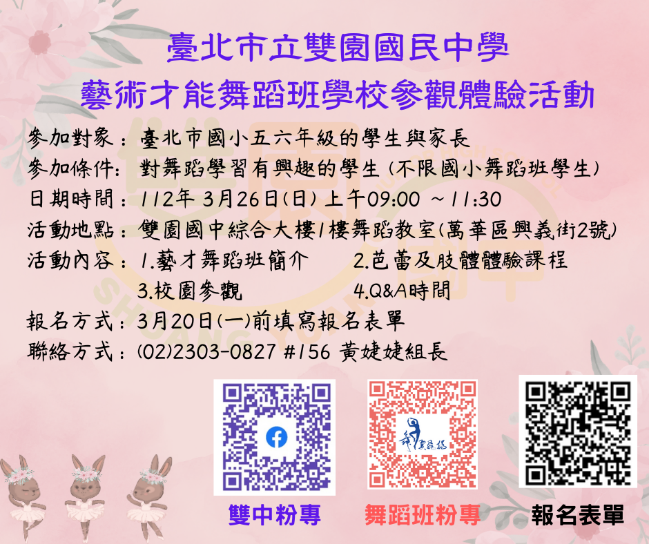 三、活動地點:臺北市立雙園國中 綜合大樓一樓舞蹈教室。