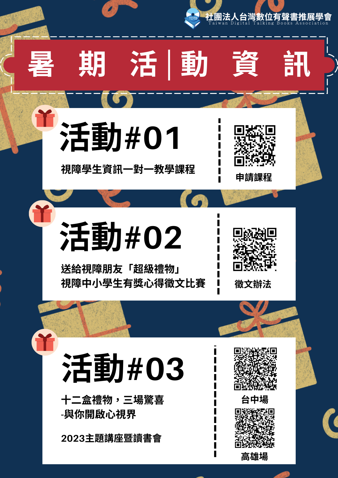 轉知~社團法人台灣數位有聲書推展協會辦理視障中小學生暑期活動,活動內容及報名方式如附件,歡迎領有身心障礙手冊之視覺障礙學生、其家長及特教或巡輔老師踴躍參加。