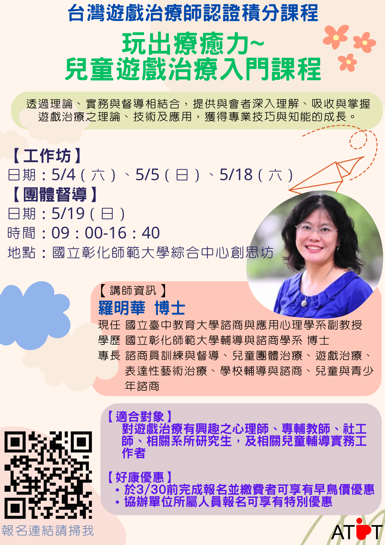 3、早鳥報名優惠至3/30止,請參考學會報名網站 (http://www.atpt.org.tw/course-id-176)。