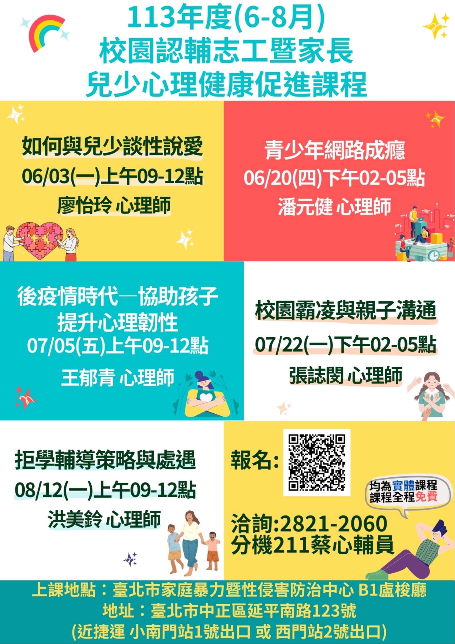 一、為增進校園認輔志工兒少相關心理衛生知能,以及家長照 顧特殊兒少之親職功能,爰辦理旨揭課程,113年6月至8月 課程資訊請協助公告海報於貴單位官網。