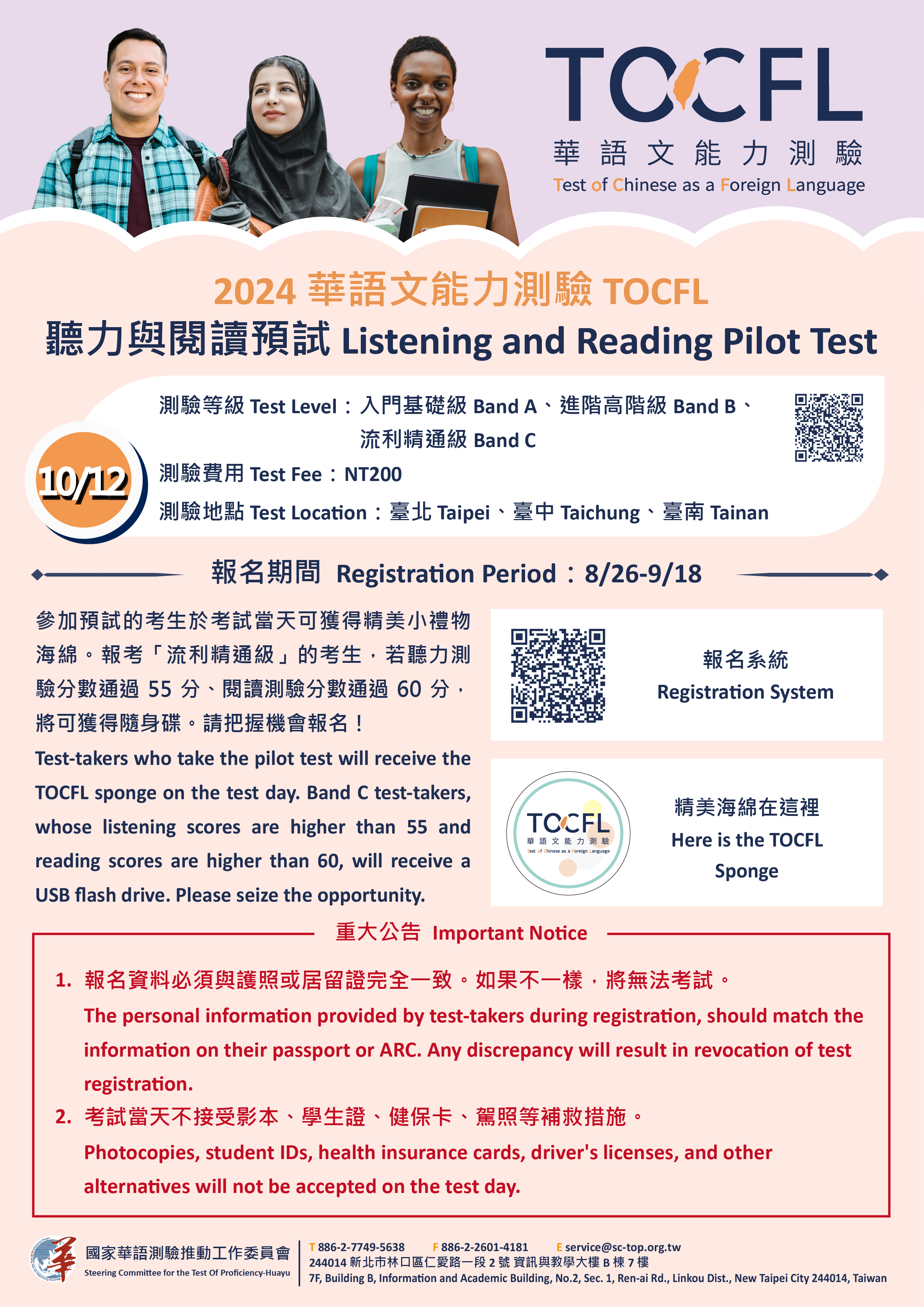 (三)測驗等級:入門基礎級Band A、進階高階級Band B、流 利精通級Band C。