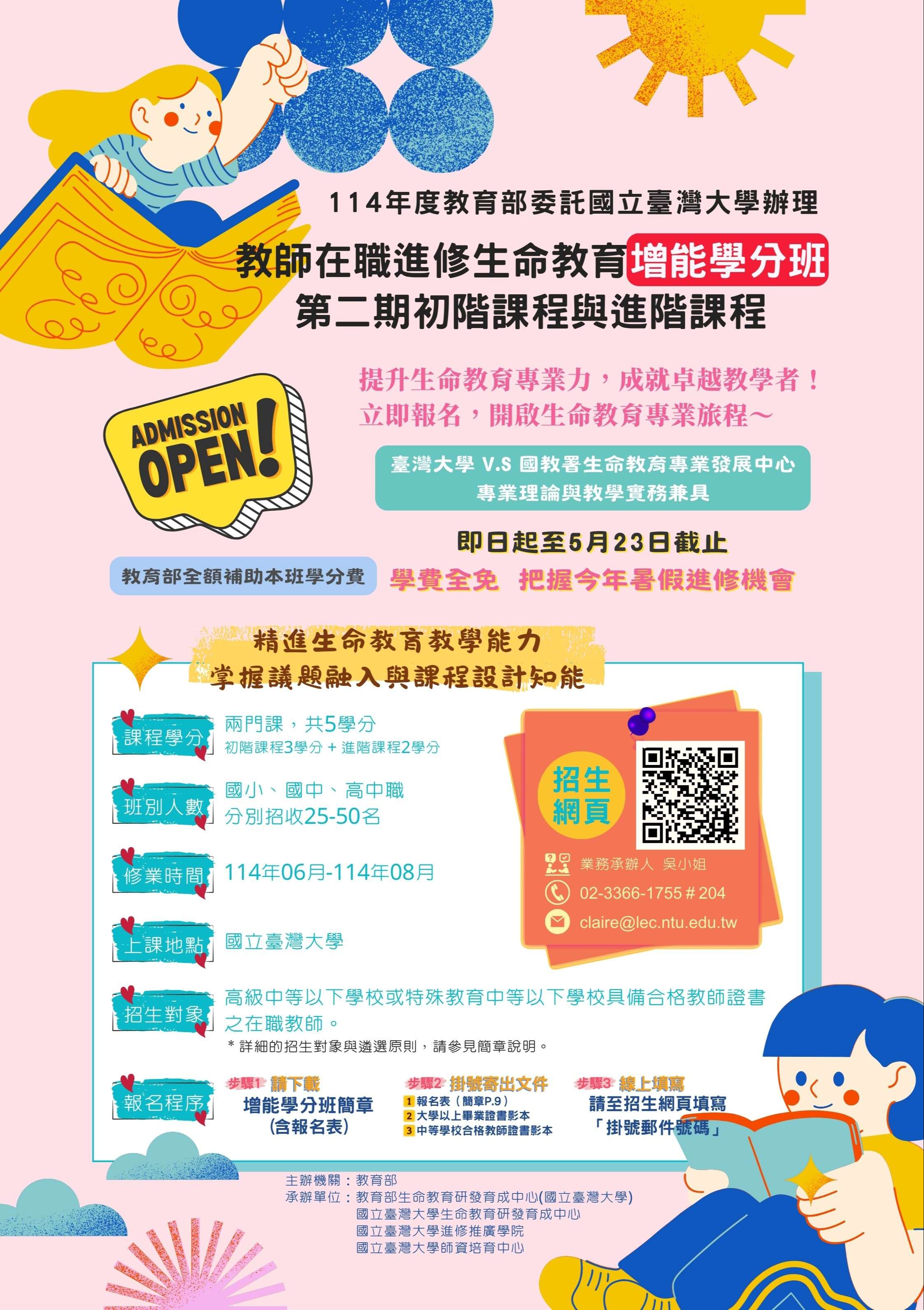 一、為培育高級中等以下學校之在職教師掌握生命教育核心素 養內涵,並具備生命教育議題融入課程之教學知能,教育 部特委託本校生命教