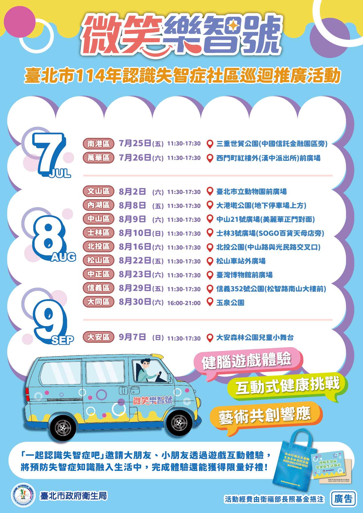 「藝術共創響應」等多元內容,巡迴本市十二行 政區,藉由趣味互動吸引民眾參與,將失智症知識融入生 活中