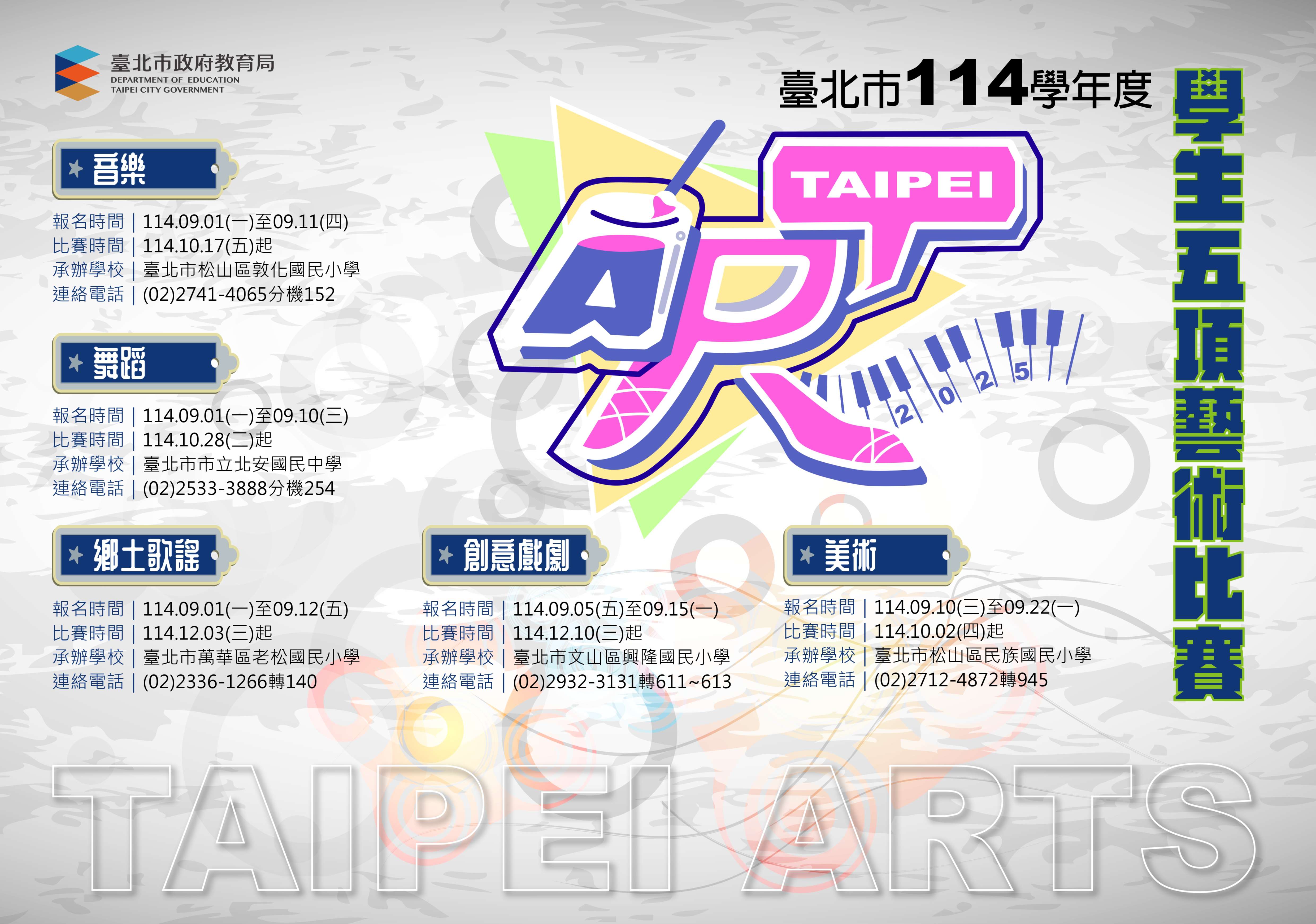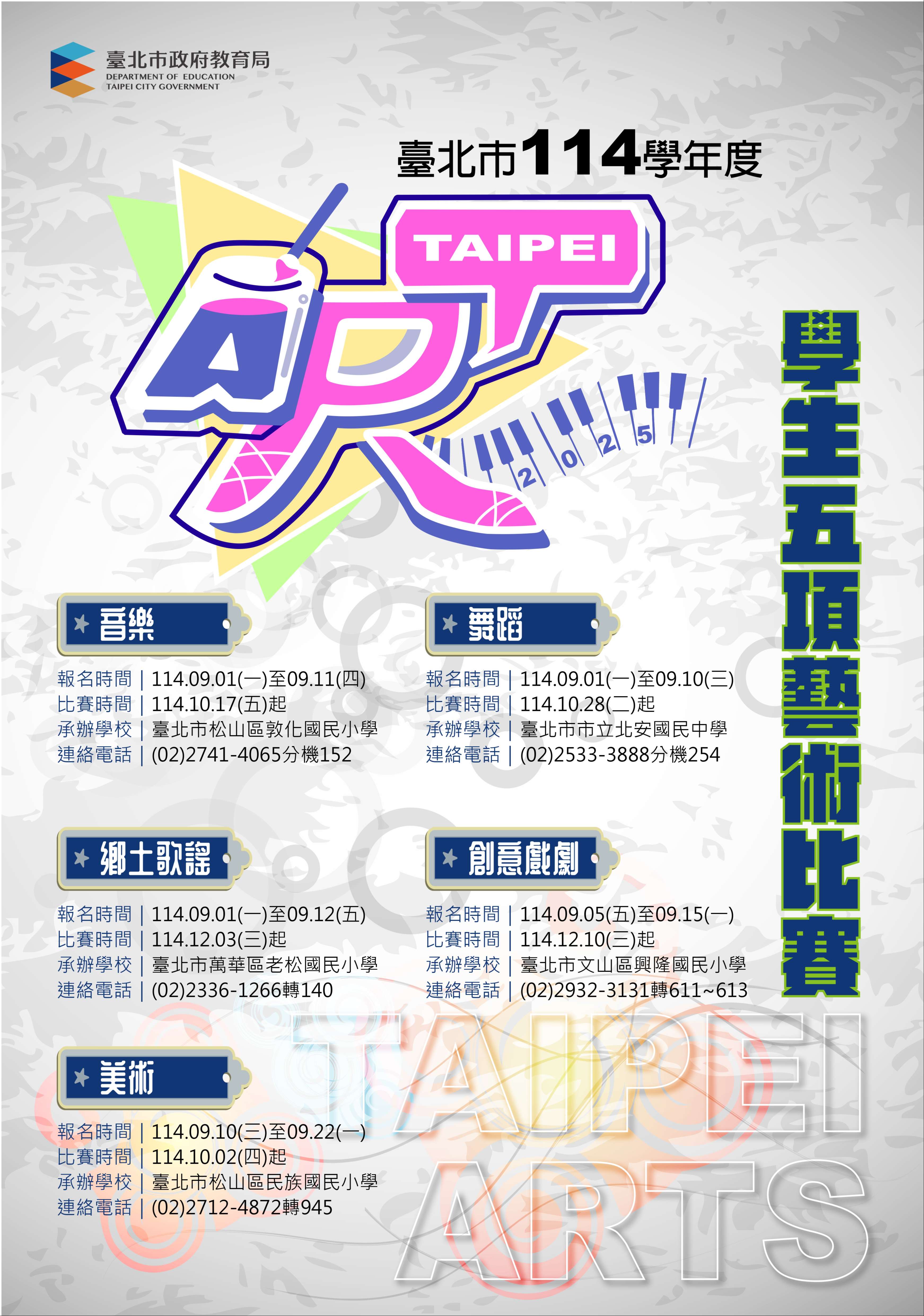 臺北市學生五項藝術(音樂、美術、舞蹈、創 意戲劇及鄉土歌謠)比賽,9/1起陸續開放網路報 名。相關訊息及作業時程,請至臺北市五項藝術比賽 網站查詢,逾期不受理。