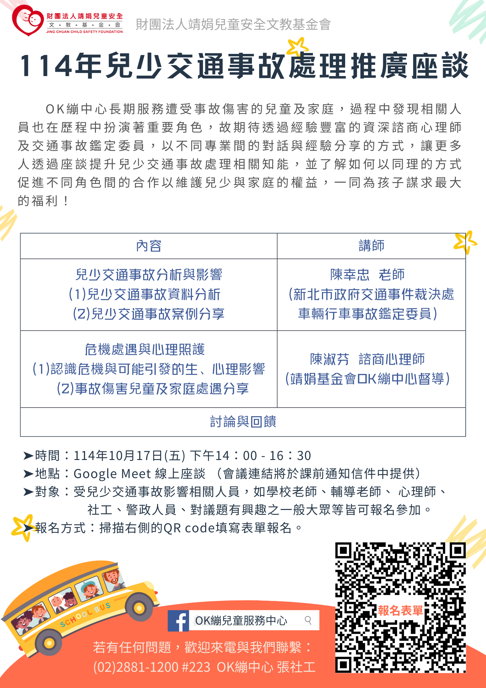 二、靖娟基金會OK繃兒童服務中心將於114年10月17日14時至16 時30分辦理兒少交通事故處理推廣線上座談,期待透過對 話方式交通、